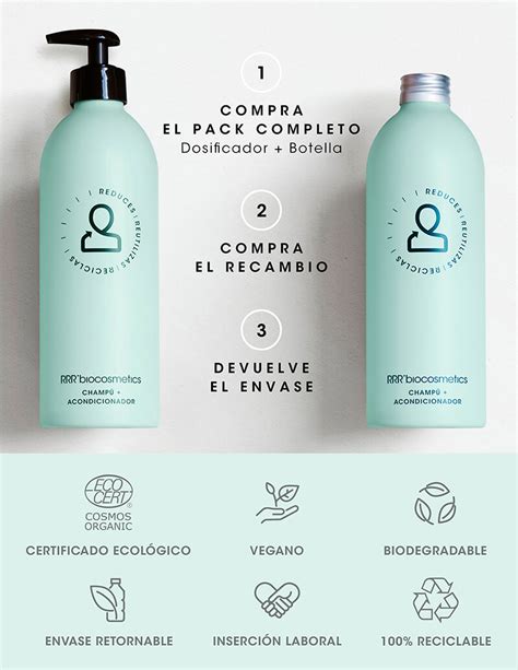 - Champú + Acondicionador Ecológico 500 ml RRR'biocosmetics: Se trata de un cosmético formulado con tensioactivos naturales (los activos encargados de eliminar la grasa y limpiar el cabello), que realizan una limpieza más suave, y enriquecido con aloe vera ecológico, que contribuye a retener mejor la humedad.