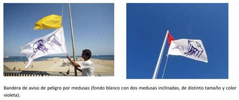 En función del grado de peligrosidad que supongan las especies arribadas a la playa, se informará a los usuarios mediante la colocación de una bandera diseñada para tal efecto (fondo blanco con dos medusas inclinadas, color violeta y de distinto tamaño). Ésta se colocará en un lugar visible para los usuarios, junto con las banderas de estado de la mar, de tal manera que: