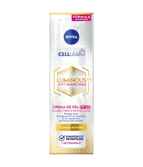 | Nivea Luminous 630 FP50+ | 50+ | Ácido hialurónico, thiamidol, Luminous 630 | Desconocida | Protección inmediata contra rayos UVA/UVB, previene y reduce manchas |