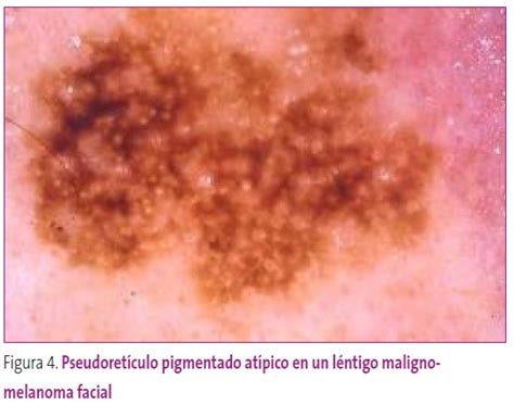 En el melanoma in situ el hallazgo más importante es la asimetría en 2 ejes, aunque comparte algunas características con los melanomas invasivos como son la presencia de puntos atípicos, de red atípica y de anillo perilesional rosa; sin embargo, existen características que no encontramos como el velo azul, la ulceración y la presencia de pseudópodos.
