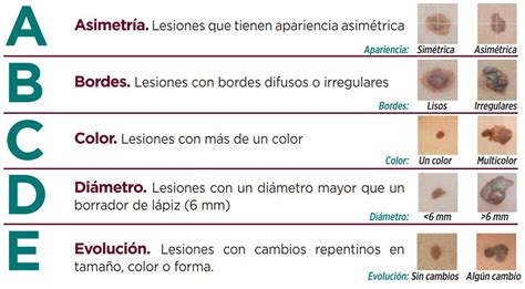- Evolución: Cambios en tamaño, forma, color, relieve o síntomas como picor, dolor o sangrado.