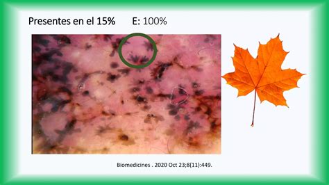 - Estructuras en hoja de arce: Se caracterizan por proyecciones o extensiones bulbosas de color marrón o azul-gris que aparecen en la periferia del tumor y avanzando sobre piel sana, en lo que también se conoce como signo de Soyer. La presencia de 2 a 3 frentes de avance contiguos es lo que confiere la imagen característica en hoja de arce. Aunque sólo se describe en un 17-50% de los CBC6, su especificidad es del 100%, por lo que se considera que es un criterio patognomónico para el diagnóstico de CBC.