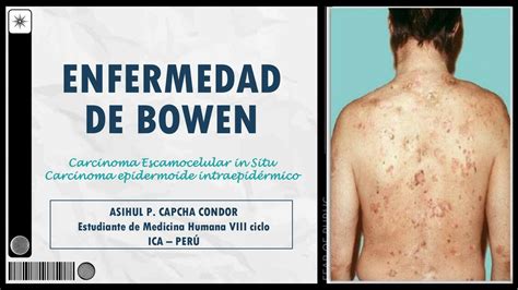 La enfermedad de Bowen es un carcinoma espinocelular in situ que se presenta como una placa eritematodescamativa de 5 mm a varios centímetros de diámetro y se localiza habitualmente en el tronco y los miembros inferiores. Este aspecto clínico habitual se asemeja al de una placa de psoriasis; en otras ocasiones la placa puede estar pigmentada y parecer una QS e incluso un melanoma.