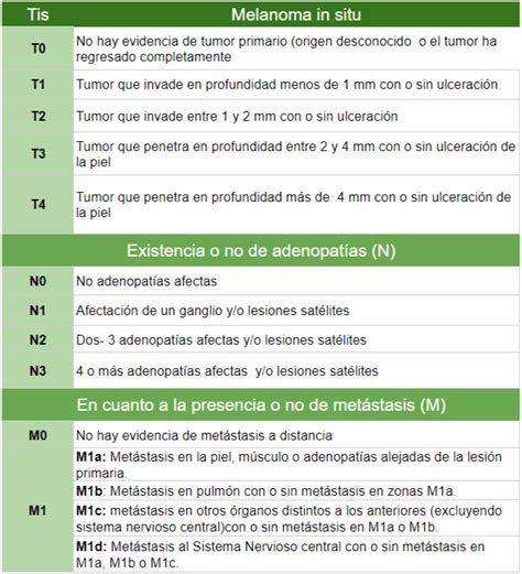 El sistema de estadificación en la tabla que sigue utiliza la etapa patológica (también llamada la etapa quirúrgica). Esta se determina mediante el examen del tejido extraído durante una operación. A menudo, si no es posible realizar una cirugía de inmediato (o en absoluto), en su lugar, al cáncer se le asignará una etapa clínica. Esto se basa en los resultados obtenidos del examen físico, las biopsias y los estudios por imágenes (como se describe en Pruebas para el cáncer de piel tipo melanoma). La etapa clínica se usará para ayudar a planear el tratamiento. Sin embargo, algunas veces el cáncer se ha propagado más de lo que se estimó basándose en la etapa clínica, de modo que tal vez no proporcione el pronóstico de una persona con tanta precisión como con la etapa patológica.
