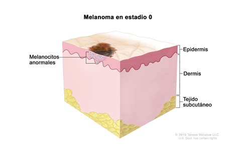 Estadio 0: Se encuentran melanocitos anormales en la epidermis. Es posible que estos melanocitos anormales se vuelvan cancerosos y se diseminen al tejido normal cercano. El estadio 0 también se llama melanoma in situ.