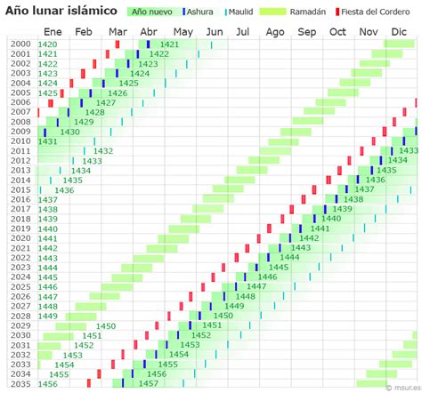 Correlación aproximada de año lunar y festivos islámicos entre los años 2000 y 2035 del calendario gregoriano