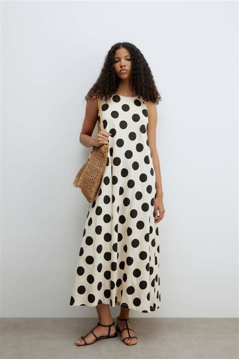 Si prefieres vestidos, Sfera también ofrece opciones de vestidos de lunares que siguen las últimas tendencias. Un ejemplo es un vestido de lunares en blanco y negro con un nudo lateral drapeado, que favorece la silueta y es fácil de poner.