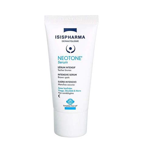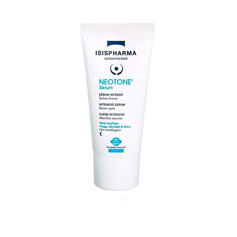 Suero despigmentante intensivo Neotone Serum, 30 ml, Isispharma Sérum despigmentante intenso. Propiedades: Elimina las manchas de pigmentación y previene su aparición. Contiene el complejo DEPI-Act (Diacetil negrita + inhibidor sintético de WNT + regaliz + niacinamida) con eficacia en todas las etapas de la formación de melanina. Efecto peeling superficial (glicólico 6%, ácido salicílico 0% parabenos • 0% fenoxietanol • no comedogénico TESTADO BAJO CONTROL DERMATOLÓGICO).