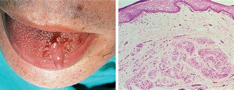 Papiloma. Este término, usado a menudo para designar histopatológicamente proliferaciones epiteliales benignas de causa imprecisa y en el lenguaje vulgar para la verruga plantar, debe reservarse para las lesiones debidas al virus del papiloma humano (VPH) en las mucosas, mientras que en la piel hablamos de verrugas. En esta localización pueden tener un carácter de transmisión sexual, y se aíslan los genotipos propios de las lesiones de la zona genital, o llegar a partir de lesiones cutáneas en los dedos por el hábito frecuente en los niños de morderse o chuparse las lesiones de los dedos. El desarrollo de lesiones malignas por genotipos oncogénicos es totalmente excepcional, al contrario de lo que ocurre en el cérvix uterino, y menos a menudo en la zona anogenital de pacientes generalmente inmunodeficientes. Clínicamente aparecen como lesiones exofíticas papilomatosas en cualquier localización de la mucosa oral, pero son más frecuentes en los labios y en la lengua (fig. 1). Suelen tener color blanquecino por la hidratación de la capa córnea. En ocasiones es necesario para el diagnóstico el estudio histopatológico, que muestra leve hiperqueratosis con paraqueratosis y acantopapilomatosis con vacuolización celular marcada en capas profundas del epitelio, pues en las mucosas es normal cierto grado en las capas altas.