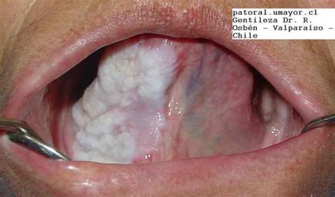 Leucoplaquia oral vellosa. Es un proceso descrito por Greenspan en pacientes seropositivos, aunque se ha visto también en pacientes trasplantados sometidos a inmunosupresores e incluso en inmunocompetentes. La lesión no es una tumoración, pero puede plantear diagnóstico diferencial con una leucoplasia premaligna, puesto que se presenta como placas blancas asintomáticas con formaciones filiformes en su superficie, generalmente en las caras laterales de la lengua (fig. 2). A diferencia del Muguet, no se desprenden al raspar con el depresor y no hay infiltración. En la histología las formaciones vellosas aparecen como proyecciones hiperqueratósicas con paraqueratosis y cúmulos de gérmenes (a menudo Candida), en cuya base hay hiperplasia epitelial con balonización celular, como ocurre en algunos procesos virales. El papel causal del Herpesvirus tipo 5 (virus de Epstein-Barr) está avalado por estudios de inmunofluorescencia y de hibridación de ADN, aunque pueden intervenir otros agentes patógenos. Su tratamiento no es imprescindible, pero pueden utilizarse queratolíticos, y se ha visto su regresión con aciclovir sistémico.