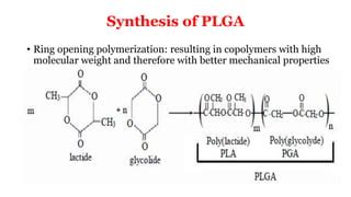 El PLGA se sintetiza mediante copolimerización de apertura en anillo de dos monómeros diferentes, los dímeros cíclicos (1,4-dioxano-2,5-diones) del ácido glicólico y el ácido láctico. Los polímeros pueden sintetizarse como copolímeros aleatorios o en bloque, lo que les confiere propiedades poliméricas adicionales.