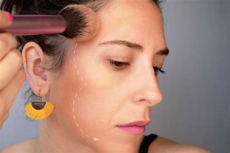 Es muy fácil. Para el día a día, empieza por la sien, dibuja una curva por debajo del pómulo, sube hasta el entrecejo por las aletas de la nariz y repite en el otro lado. Después, difumina haciendo movimientos circulares con la brocha. ¿Otra posibilidad? Dibuja pequeños ochos con la brocha por todo el rostro.
