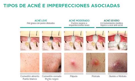 La etiología del acné es multicausal, aunque la participación de *Cutibacterium acnes* es relevante. Las lesiones pueden ser no inflamatorias (comedones, abiertos o cerrados), inflamatorias (pápulas, pústulas, nódulos o quistes) o residuales (máculas o cicatrices). El acné puede clasificarse según su intensidad en leve (predominancia de comedones, con pápulas escasas), moderado (predominancia de pápulas y pústulas, con comedones) y grave (presencia de nódulos inflamatorios y quistes).
