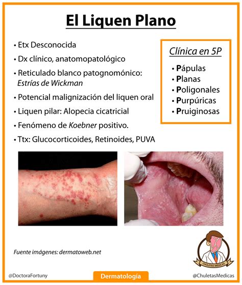 Cualquier persona puede desarrollar liquen plano, aunque afecta con mayor frecuencia a los adultos de mediana edad. El liquen plano puede ser difícil de tratar en la vulva y en la vagina, pudiendo dejar cicatrices y provocar dolor intenso. Las llagas bucales pueden afectar la capacidad de comer, y el liquen plano oral aumenta el riesgo de cáncer bucal. En raras ocasiones, el liquen plano afecta el conducto auditivo.Características Clínicas del Liquen Plano