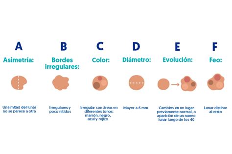 - E - Evolución: si un lunar aparece en poco tiempo o cambia rápido hay que pedir cita con el especialista. Presta atención a los lunares que cambian de tamaño, forma, color o relieve.
