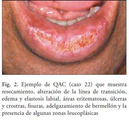 La queilitis actínica es una forma de queratosis actínica que afecta específicamente los labios. Es una lesión premaligna, lo que significa que si no se trata, existe el riesgo de que se desarrolle en un carcinoma de células escamosas, un tipo de cáncer de piel. Se presenta generalmente como parches rojos o escamosos en los labios y puede ser dolorosa o causar molestias al hablar o comer.
