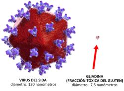 Comparativa de tamaño: virus del VIH (izda.) versus gluten (dcha.).