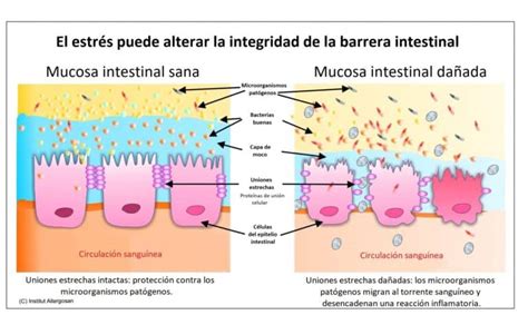 Esquema de la pared del intestino con permeabilidad aumentada.