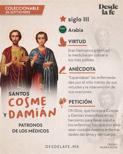 San Cosme y San Damián, hermanos gemelos nacidos en el siglo III d. C., son conocidos por su habilidad en la medicina y su fe cristiana. La leyenda cuenta que realizaron un trasplante milagroso a un sacristán que tenía la pierna corroída por el cáncer. En un sueño, los santos aparecieron al sacristán y le trasplantaron la pierna de un hombre negro recién fallecido.