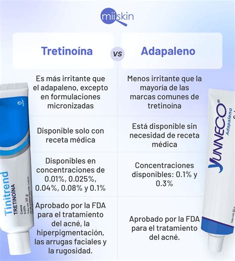 La tretinoína está disponible en forma de cremas, geles y lociones. El adapaleno con una concentración más baja del 0.1% se puede comprar sin receta médica.