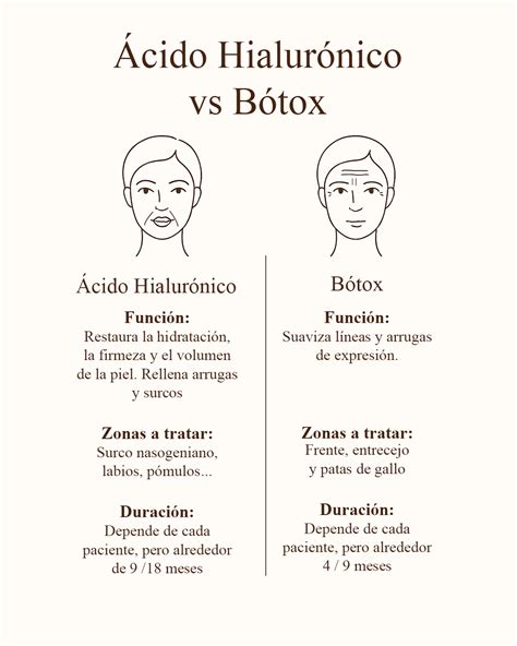 - Mecanismos de acción: El ácido hialurónico ayuda a hidratar y rellenar las líneas finas y arrugas, creando un aspecto más suave y juvenil. Por el contrario, el botox actúa relajando los músculos que causan las arrugas y líneas de expresión en la piel.