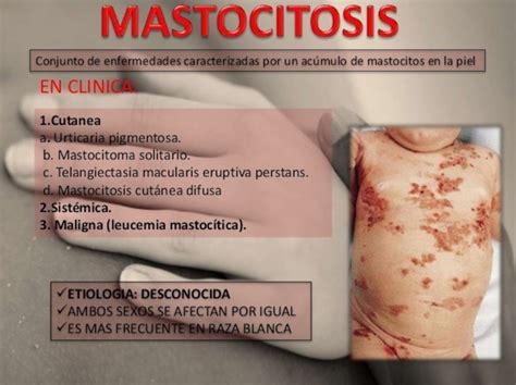 | Mastocitosis Cutáneas | Afectan principalmente la piel. Incluyen máculo-papulosa, en placas, mastocitoma, cutánea difusa y telangiectásica. |