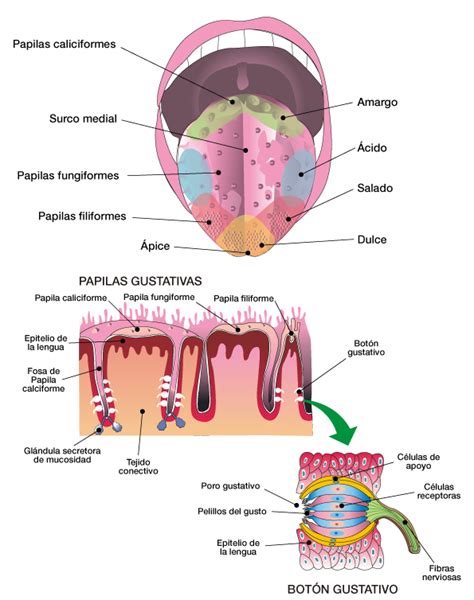 Los receptores gustativos están distribuidos en distintas áreas en la lengua, aunque también existen zonas extralinguales en las que podemos encontrar sensibilidad gustativa como la epiglotis, el paladar y paredes de la faringe entre otras.