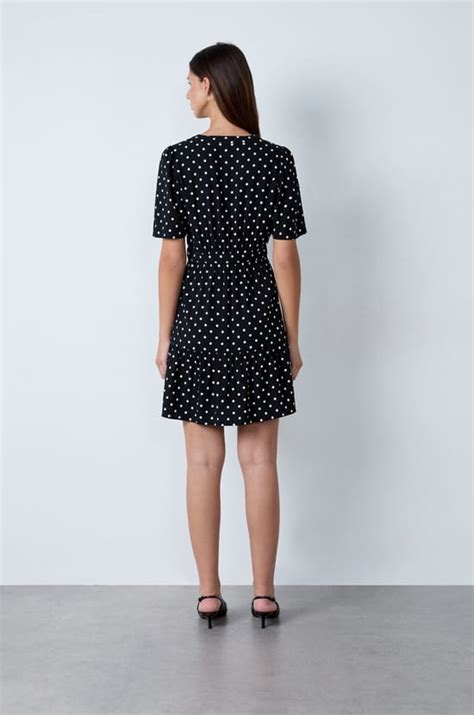 Para las que buscan un estilo más fresco y juvenil, el vestido corto de lunares de Lefties es la opción ideal. Con un escote drapeado, mangas estilo capa y un estampado de lunares en blanco y negro, este diseño destaca por su originalidad y favorecedor corte.