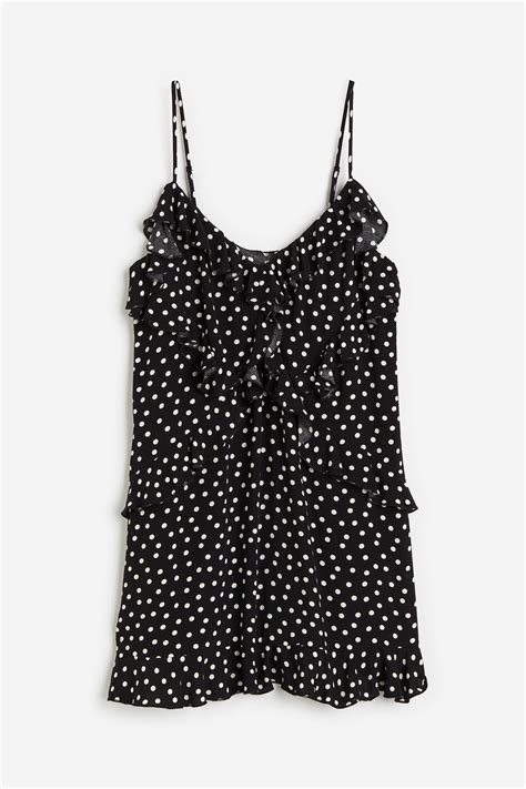 H&M presenta un vestido corto de lunares con volantes, una tendencia muy actual. Los volantes adornan el escote, la parte delantera y el bajo del vestido, que cuenta con tirantes finos ajustables y escote de pico.