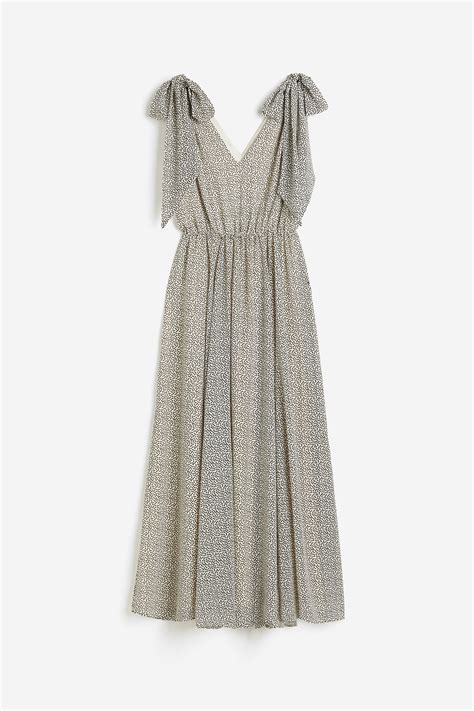 H&M también ofrece un vestido largo de lunares con lazos en los hombros. Este diseño, en color crema, presenta un escote de pico, tirantes anchos fruncidos, falda con vuelo y forro interior.