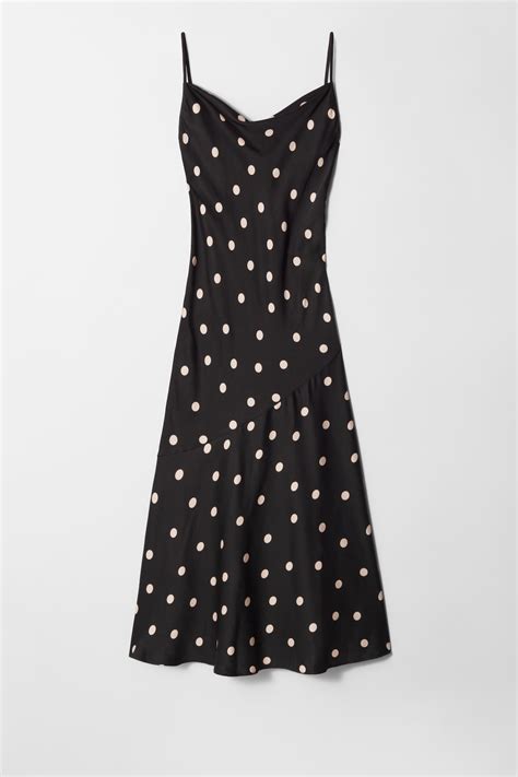 Para la primavera 2024, H&M propone un vestido midi lencero en color crema con estampado de lunares. Este diseño entallado en tejido satinado cuenta con escote corazón, copas preformadas y tirantes elásticos fruncidos. La clave para lucir esta tendencia es combinarlo con piezas exteriores como chaquetas vaqueras o bombers.