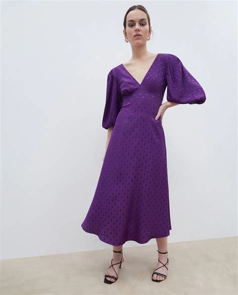 Uno de los diseños más destacados de la firma es el vestido midi satinado morado con mangas abullonadas y lunares tipo jacquard. Este vestido es perfecto para invitadas a comuniones, bautizos o bodas, y se puede combinar con accesorios de diferentes colores, como rosa chicle, naranja, azul turquesa o verde lima.
