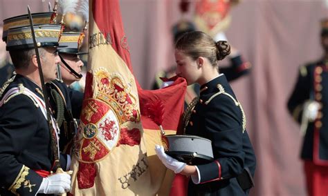 La princesa Leonor ha jurado bandera este 7 de octubre en la Academia General Militar de Zaragoza en una solemne ceremonia castrense presidida por sus padres, Felipe VI y Letizia. Los reyes se han emocionado en el momento en el que la heredera al trono, la cadete Borbón Ortiz, ha besado la bandera de España, una muy especial realizada en 1886 por encargo por la reina María Cristina de Habsburgo.