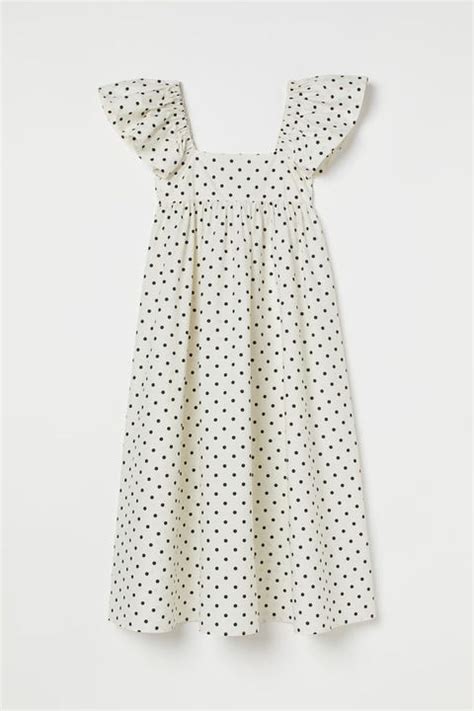 | H&M | Vestido largo de algodón con tirantes de volante y estampado de lunares negros sobre fondo blanco. | 50€ | XS a XXL |
