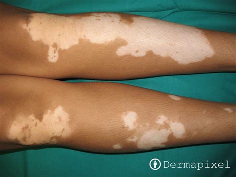 El diagnóstico diferencial incluye hipopigmentación posinflamatoria, piebaldismo (un trastorno autosómico dominante poco frecuente en el que se observan zonas despigmentadas en parches rodeadas de zonas hiperpigmentadas, con mayor frecuencia en la frente, el cuello, la parte anterior del tronco y la parte media de las extremidades), morfea (esclerodermia localizada, en la que la piel suele ser esclerótica), lepra (en la que las lesiones suelen ser hipoestésicas), liquen escleroso, pitiriasis alba, leucodermia química y leucodermia debido a melanoma.