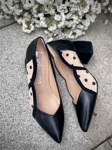 - Zapato Angari Zapatos Lunares Negro: Un elegante salón de Angari Zapatos con lunares negros, confeccionado en 100% piel con fabricación artesanal en España. Cuenta con una suela de goma antideslizante y plantilla de gel para máxima comodidad. Altura de tacón: 6cm.